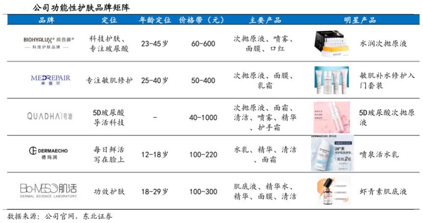 經典案例:根據公司官網、東北證券等綜合資訊表明,華熙生物依托技術優勢,打造多品牌進駐功能性護膚領域。2018 年在原有“潤百顏”品牌基礎上,陸續推出“BIO-MESO”、“米蓓爾”、“夸迪”、“德瑪潤”、“華熙頤寶”等多個新品牌。新品牌以透明質酸及其他生物活性物質為核心成分,針對敏感皮膚、皮膚屏障受損等不同的皮膚問題定位精準人群。功能性護膚品將成為公司未來業績增長的重要驅動力。
