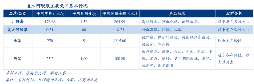 經典案例:根據東阿阿膠公司的公開資料顯示,其明星產品“復方阿膠漿”適用人群廣泛,年均藥費支出約 1200 元(顯著低于阿膠塊、蟲草、燕窩等高端中藥滋補品),保健養生需求、送禮需求、臨床治療需求三大消費訴求明顯。