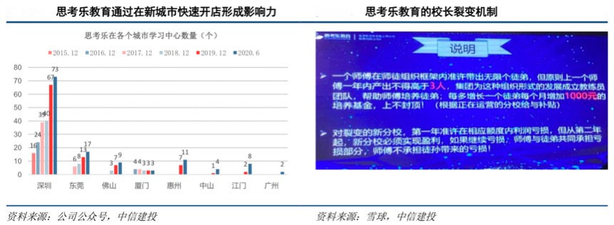 經(jīng)典案例:根據(jù)公司公眾號(hào)、中信建投、雪球等綜合資訊表明,在新進(jìn)入城市時(shí),思考樂(lè)教育采取高舉高打的節(jié)奏快速開(kāi)店,在當(dāng)?shù)匦纬捎绊懥ΑR詵|莞為例, 2017、2018、 2019、2020年6月,其學(xué)習(xí)中心數(shù)量分別為6、8、13、17 家。快速擴(kuò)張過(guò)程中思考樂(lè)采用“裂變機(jī)制”解決新校區(qū)校長(zhǎng)及運(yùn)營(yíng)團(tuán)隊(duì)及時(shí)跟上的難題,比如通過(guò)深圳原有成熟校區(qū)的運(yùn)營(yíng)團(tuán)隊(duì)來(lái)定向支持異地新校區(qū)、師傅校長(zhǎng) 帶出徒弟、徒孫校長(zhǎng),并能分得相應(yīng)提成方式合作共贏,以“人員裂變”推動(dòng)組織成長(zhǎng)。