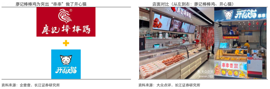 經典案例:根據企查查、大眾點評、長江證券研究所等綜合資訊表明,廖記棒棒雞創立于 1993 年,崛起于西南,全國開店超 600 家,經營鹵菜、拌菜、串串等。同時其于2018年又創辦新品牌“開心貓”串串香,縮減廖記本店的柜面,將原有的“三個區域”包裝食品、菜肴熟食、冷鍋串串縮減為以“冷鍋串串”為主,店鋪更小,精準聚焦商場中“逛吃”的休閑需求。
