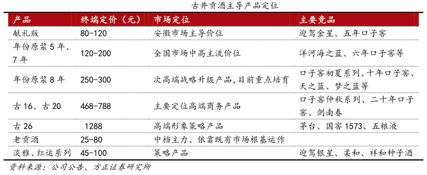 經典案例:根據公司公告、方正證券研究所等綜合資訊表明,古井貢酒強品牌主導各產品定位有所不同,年份原漿自2008年推出后,即取得了超常規的成長業績,在銷售結構中占比不斷提高,帶動利潤大幅增長。截止2019年底,其“年份原漿”系列營收占比達 85%左右,其中古 8 及以上占比超過25%。