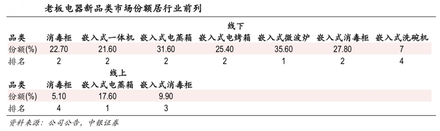 經(jīng)典案例:根據(jù)公司公告、中銀證券等綜合資訊表明,2015年老板電器推出下翻嵌入式洗碗機(jī),定義廚房高端生活美學(xué); 2019 年推出臺嵌兩用洗碗機(jī),解決安裝改造問題,持續(xù)引領(lǐng)行業(yè)發(fā)展。據(jù)老板電器2019年年報(bào)披露,老板嵌入式一體機(jī)、嵌入式電蒸箱、嵌入式電烤箱、嵌入式洗碗機(jī)市場份額分別為 21.6%(市場第 2)、31.6%(市場第 2)、25.4%(市場第 2)、7.0%(市場第 4)。