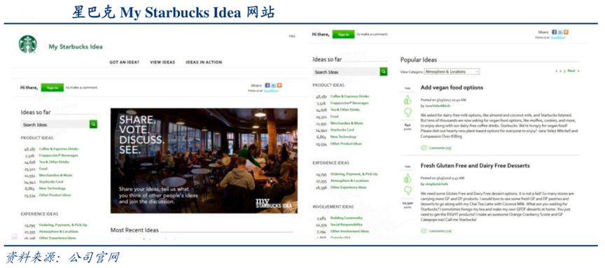 經(jīng)典案例:根據(jù)公司官網(wǎng)、華創(chuàng)證券等綜合資訊表明,星巴克 2008 年建立了 My Starbucks Idea 網(wǎng)站,收集顧客從產(chǎn)品口味、店內(nèi)體驗、會員卡、店內(nèi)設(shè)計到企業(yè)社會公益等多個方面的想法,成功孵化的產(chǎn)品包括抹茶可可碎片星冰樂,南瓜絲絨拿鐵等明星單品。