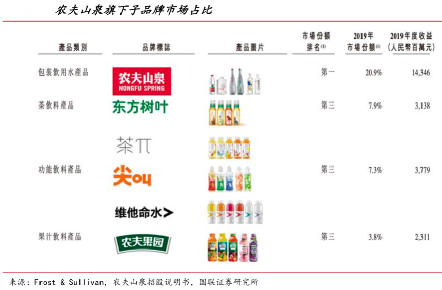 經典案例:根據Frost&Sullivan、農夫山泉招股說明書、國聯證券研究所等綜合資訊表明,農夫山泉主營的包裝水業務自2012年起占據行業龍頭地位,2019 年公司包裝水產品收益為 143.46 億元,市場份額達20.9%。占據公司總營收 4 成的茶飲料、功能飲料和果汁飲料業務的市場份額都分列各自細分市場第三位。