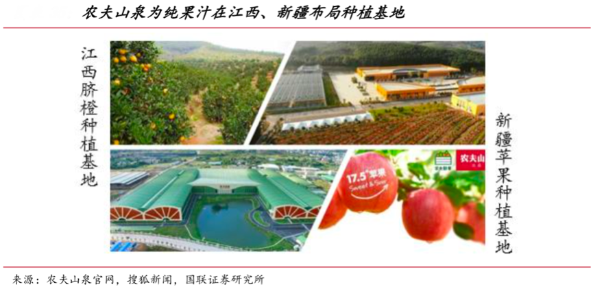 經典案例:根據農夫山泉官網、搜狐新聞、國聯證券研究所等綜合資訊表明,農夫山泉提早洞察果汁行業趨勢,在 2002 年和 2007 年就在新疆和江西布局種植基地,培育蘋果和臍橙;并在 2016 年 推出了使用自產的 17.5°橙和蘋果為原料的純果汁,主打非濃縮還原和無添加。