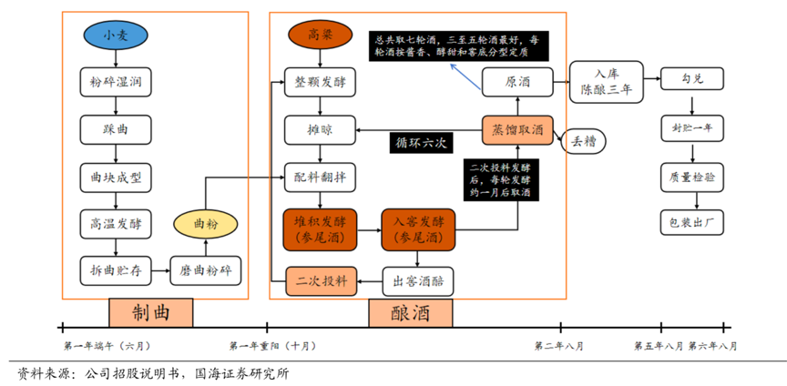 經典案例:根據公司招股說明書、國海證券研究所等綜合資訊表明, 茅臺制酒的生產工藝有“鮮明特色”,其用純凈小麥制成的高溫大曲和高粱作釀酒原料,經二次投料,九次蒸煮,八次攤涼、加曲、堆積、八次發酵,七次摘酒,茅臺每個輪次還根據每次出酒的特性,分為三種典型酒體,分別是:醬香、醇甜、窖底。然后 根據品質進行一等、二等、三等評級。就這樣分輪次、分酒體、分等級,裝在酒壇里貯存 3 年以上(其間有盤勾工藝)。