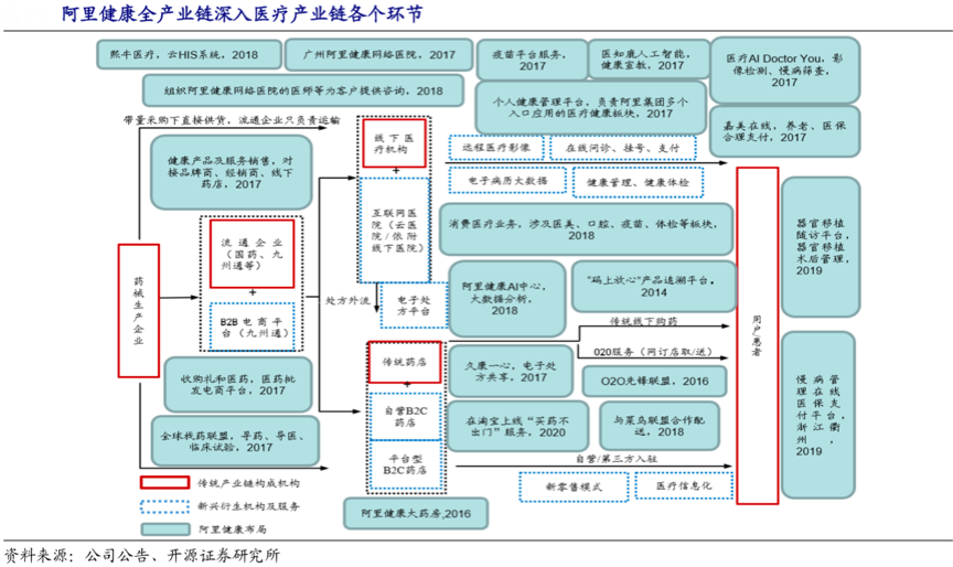 經典案例:根據(jù)公司公告、開源證券研究所等綜合資訊表明,阿里健康全產業(yè)鏈已經深入到醫(yī)療產業(yè)鏈的各個一節(jié),其以廣州阿里健康網絡醫(yī)院等為醫(yī)療服務的線下落地點,以熙牛醫(yī)療、醫(yī)療AI等為強技術支撐,自 2011 年起布局大健康產業(yè)。阿里巴巴“醫(yī)療健康服務生態(tài)”日臻完善。