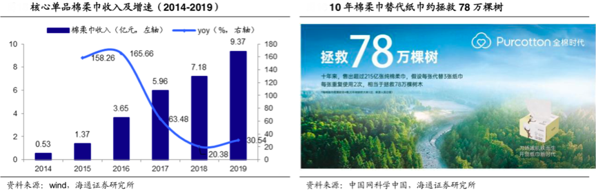 經典案例:根據(jù)wind、海通證券研究所、中國網科學中國等綜合資訊表明,全棉時代革新性推出純棉柔巾,采用全棉材質,具有產品舒適、化學刺激少的功能特性,很適合給寶寶使用,同時2019 年公司核心單品棉柔巾收入9.37 億元增 30.54%,2014-2019 年 CAGR 為 77.51%。
