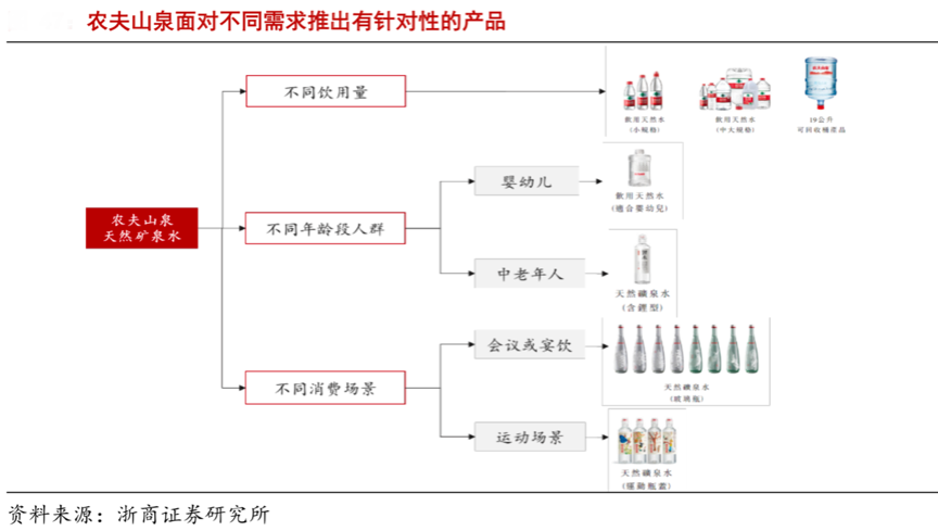經典案例:根據(jù)浙商證券研究所等綜合資訊表明,農夫山泉面對不同需求推出有針對性的產品,以包裝水為例,針對不同飲用量需求,農夫山泉推出了380ml-12L 的各規(guī)格飲用水;針對不同年齡段,推出面向嬰幼兒的飲用天然水、面向中老年人補充與神經系 統(tǒng)相關鋰元素的天然礦泉水(含鋰型);針對不同消費場景,推出了定位為會議或宴飲飲用的高端產品天然礦泉水(玻璃瓶),以及面向運動場景所設計的可單手開瓶蓋的天然礦泉水(運動瓶蓋)。產品的多場景銷售,驅動著公司產業(yè)品牌的快速變現(xiàn)。