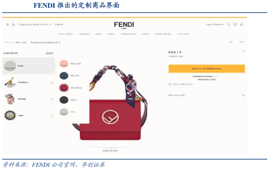 如根據華創證券、公司品牌官網等綜合資訊顯示,LVMH 集團旗下奢侈品牌 Fendi 就于近年開始了定制化的轉型,推出線上服務“Customize It”,消費者可以在這里在線創造具有 自己個性的包包手袋,平臺將提供 120 多種不同的材質、顏色、標致和其他細節的選項,還可任意搭配肩帶。