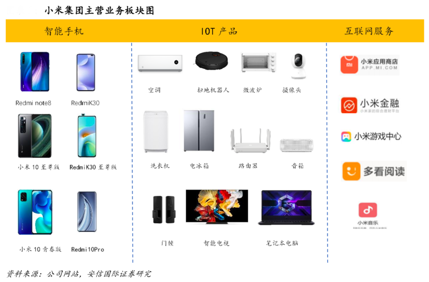 經典案例:根據公司網站、安信國際證券研究等綜合資訊表明,小米已經基本完成“全生態鏈布局”,其公司的主營業務包括智能手機、IoT 與生活消費產品、互聯網服務。在智能手機領域其分出了小米與紅米兩大主品牌以及其他子品牌,其中小米致力于高端市場,而紅米則主攻極致性價比;在 IOT 產品領域,其通過智能電視、可穿戴設備等在智能生活領域扮演控制中樞角色從而連通公司產業鏈其他的產品,進而構建智能生活未來;在互聯網服務方向,其廣告服務以及線上游戲以及小米金融的金融服務等增值服務是其收入的主要構成部分。