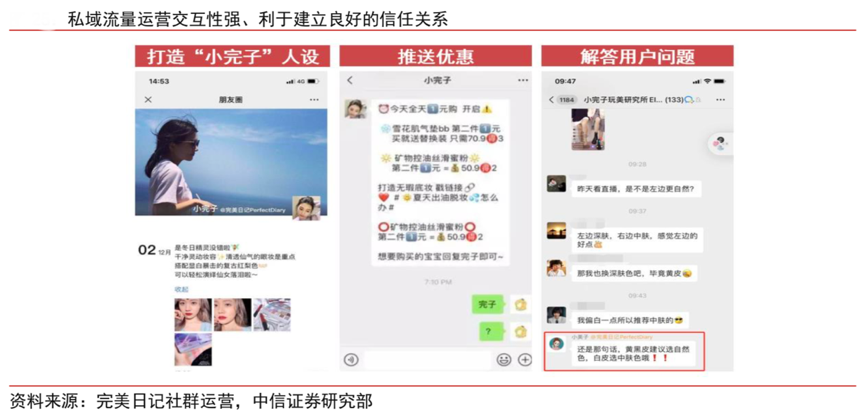 經典案例:根據完美日記社群運營、中信證券研究部等綜合資訊表明,完美日記通過打造導購“小完子”的精致少女人設,不定期向用戶推送商品優惠、解答用戶問題,有效拉近了與用戶的距離。同時品牌能夠通過微信群、個人微信等載體,實現與用戶的雙向溝通,通過發布用戶調研等方式洞察消費者的真實需求。