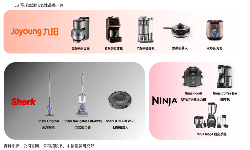 經典案例:根據公司官網、公司招股說明書、中信證券研究部等綜合資訊表明,JS環球生活公司為全球第六大小家電企業,其陸續推出了破壁機、蒸汽拖把和 Foodi 系列等全新小家電品類,均收獲市場熱捧。截至 2020H1,其旗下的九陽始終穩坐中國小家電行業前三甲;Shark 主攻清潔電器領域,其中美國市場吸塵機/掃地機器人分別位居第一/第二,市占率超越戴森;Ninja主攻廚房電器領域,其中美國市場多功能烹飪煲/破壁機等品類位居第一。