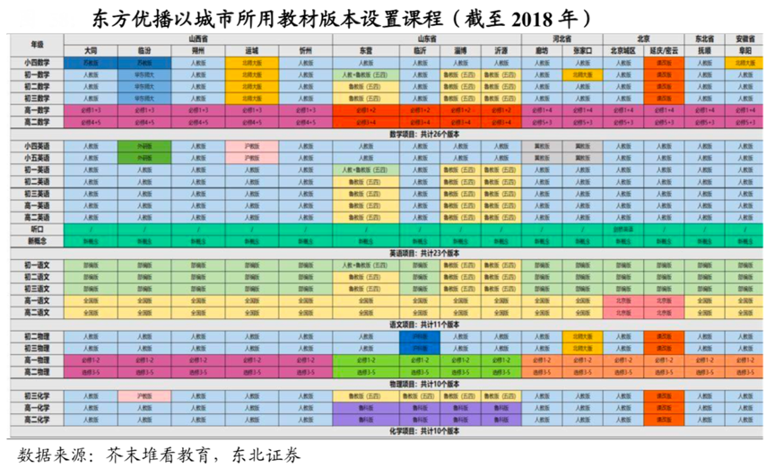 經(jīng)典案例:根據(jù)芥末堆看教育、東北證券等綜合資訊表明,東方優(yōu)播的課程設(shè)置是以城市為單位的獨立課程,緊貼本地教材內(nèi)容,教研團(tuán)隊會在考慮當(dāng)?shù)亟滩那闆r和學(xué)生接受能力的基礎(chǔ)上,對不同地域設(shè)置差異化的課程。東方優(yōu)播 2018年根據(jù)不同學(xué)科對進(jìn)駐城市所使用的教材進(jìn)行了研究,出臺個性化的教學(xué)方案。在學(xué)生選課時,東方優(yōu)播也會根據(jù)學(xué)生所在地進(jìn)行班級劃分。