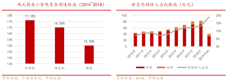 經典案例:根據產業信息網、wind、華西證券等綜合資訊表明,隨著國際化進程推進及西式餐飲年輕受眾成為適齡消費人群,國內西式小廚電滲 透率提升,需求帶動內銷市場快速增長。以西式小家電代工龍頭新寶為例,其內銷收入占比已由 2010 年的7%提高至 2019 年上半年的19%,制造優勢等是其市場經營之基。