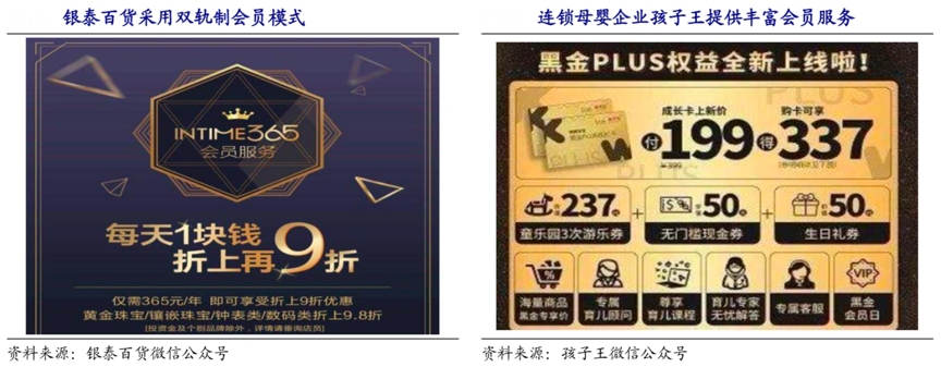 經典案例:根據銀泰百貨微信公眾號、孩子王微信公眾號、開源證券研究所等綜合資訊表明,國內線下零售企業主要采取雙軌制模式,如銀泰百貨的INTIME 會員,消費者只需繳納 365 元/ 年的會費即可享受 9 折優惠,并可享受包郵、免費停車、洗車等附加服務。線下母嬰連鎖企業孩子王 也推出黑金 PLUS 會員卡,消費者成為會員后除可以獲得各種優惠外,還可享受其提供的專屬育兒顧問服務,至 2018 年會員數量已超 2300 萬。