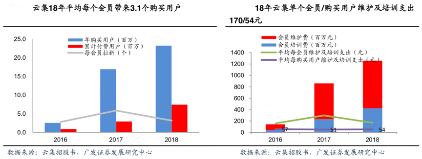 經(jīng)典案例:根據(jù)云集招股書、廣發(fā)證券發(fā)展研究中心等綜合資訊表明,從平臺(tái)獲客視角考慮,云集依靠店主分享拉新是成本較低的電商引流模式。將云集會(huì)員維系支出視作平臺(tái)引流成本,平攤至所有會(huì)員,則對(duì)應(yīng)2018年云集平均每個(gè) 會(huì)員維護(hù)及培訓(xùn)支出約170元;若進(jìn)一步平攤至購(gòu)買用戶(即一般電商公司定義的用 規(guī)模),則對(duì)應(yīng)18年云集單個(gè)購(gòu)買用戶支付僅為54元,對(duì)比電商同行,無(wú)疑是低 成本的引流獲客方式。