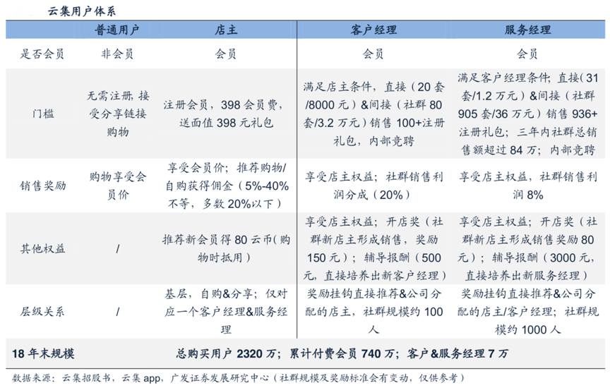 經(jīng)典案例:根據(jù)云集招股書、云集APP、廣發(fā)證券發(fā)展研究中心等綜合資訊表明,除普通購(gòu)買用戶外,云集會(huì)員體系分為三級(jí):即店主→客戶經(jīng)理→服務(wù)經(jīng)理,且平臺(tái)規(guī)定每位店主僅唯一對(duì)應(yīng)一位客戶經(jīng)理和服務(wù)經(jīng)理。2018年云集平臺(tái)共擁有2320萬(wàn)購(gòu)買用戶,累計(jì)付費(fèi)會(huì)員740萬(wàn),客戶&服務(wù)經(jīng)理超過(guò)7萬(wàn)人。