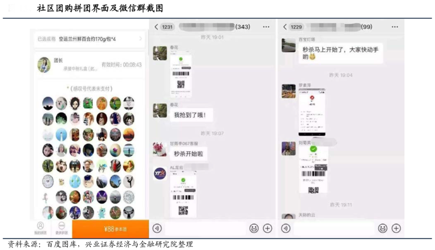 經典案例:根據百度圖庫、興業證券經濟與金融研究院等綜合資訊表明,社區團購的日常推廣場景發生在社群內,本質上是一種社區拼團購物方式,在群內推廣和其他消費者、甚至是社區內熟人朋友購物的氛圍下,對于天生熱愛購物的人群而言,較易產生跟風購物的現象。