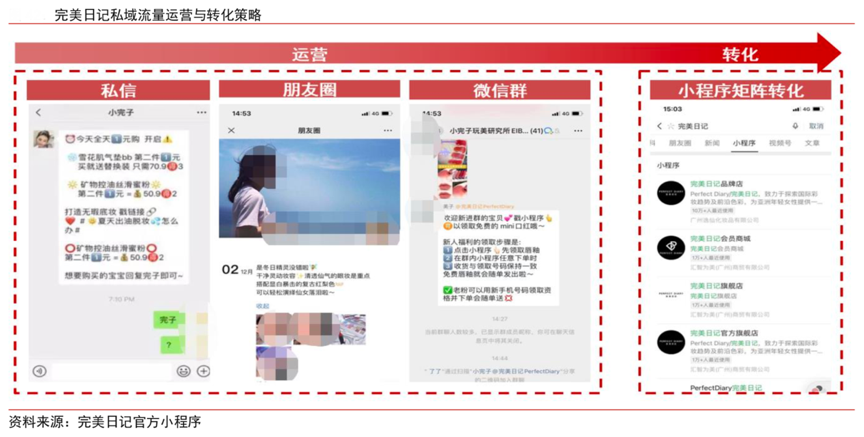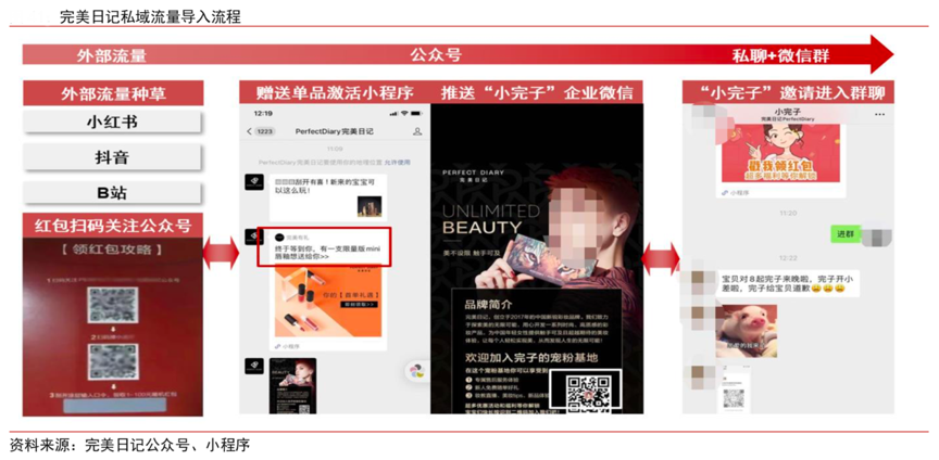 經(jīng)典案例:根據(jù)完美日記公眾號(hào)、小程序、中信證券研究部等綜合資訊表明,完美日記在小紅書 MAU 增長(zhǎng)放緩后開始加大抖音、B 站等平臺(tái)的投放,持續(xù)種草擴(kuò)大影響力,同時(shí)通過(guò)私域流量運(yùn)營(yíng)進(jìn)一步培育品牌粘性與忠誠(chéng)度。完美日記的產(chǎn)品包裹附送“紅包卡”, 引導(dǎo)用戶關(guān)注公眾號(hào)并添加“小完子”企業(yè)微信。用戶通過(guò)“小完子”邀請(qǐng)加入用戶群,完成私域流量沉淀。