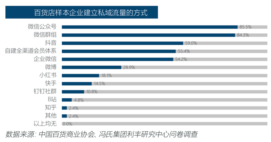 經典案例:根據中國百貨商業協會、馮氏集團利豐研究中心問卷調查等綜合資訊表明,零售商將一群對自己公司品牌認可的消費者通過自媒體、社交群組等聚集起來,可以在任意時間、免費直達客戶群,與他們保持及時溝通,并通過各種活動及內容維持用戶黏性,實現營銷轉化。新冠疫情加快了實體百貨商 場數字化轉型,百貨零售企業積極通過各大社交媒體建立自己的私域流量,進行更精準的營銷,推動加快 “貨找人”的過程。根據調查,微信公眾號及微信群組被認為是最適合做私域流量的陣地。