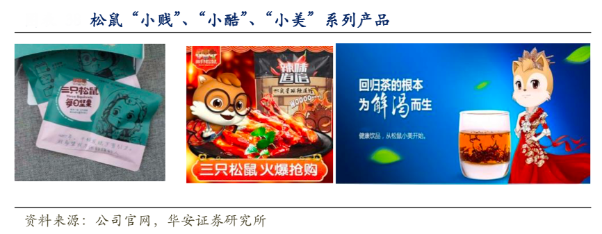 經典案例:根據公司官網、華安證券研究所等綜合資訊表明,三只松鼠公司以堅果起家,松鼠形象和堅 果品類高度契合,代表著不同系列產品,“小酷”——干果類產品,“小賤”——休閑 零食類產品,“小美”——花果類產品。其以動畫為支點,持續性的內容輸出幫助建立縱深的產品線。