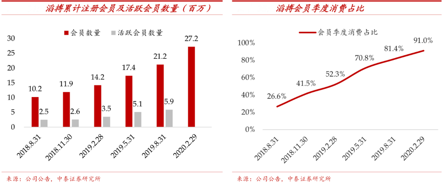 經典案例:根據公司公告、中泰證券研究所等綜合資訊表明,目前滔搏公司直營門店網絡每天服務逾 200 萬名消費者,2018 年 5 月,其對 TopFans 會員計劃進行了調整,根據會員每年的消費金額將其分為四級: 普通卡會員(占比 79.3%)、金卡會員(占比 18.4%)、黑卡(占比 1.4%) 和鉆石卡會員(占比 0.9%),門檻從 199 到 999 元。截止 FY2020,公 司已擁有約 2720 萬名注冊會員,同比+91.5%。