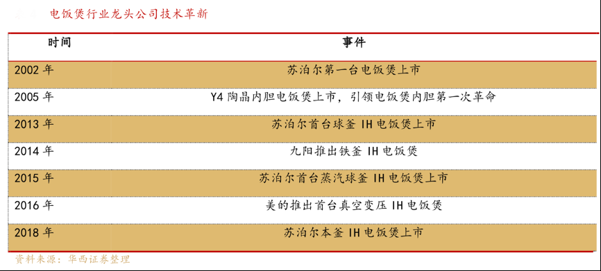 經典案例:根據華西證券等綜合資訊表明,蘇泊爾以明火炊具起家,在廚房用品和明火炊具知名度常年位居行業第一,目前電飯煲市場份額僅次于美的,截至 2018 年 9 月達到 30.5%。其推出了國內首臺球釜 IH 電飯煲、首臺蒸汽球釜 IH 電飯煲,美的推出國內首臺真空變壓 IH 電飯煲、首臺非溫控電壓力鍋等,龍頭在傳統品類上能夠持續深耕,從技術到功能設計等進行產品創新升級,在原有品類的市場基礎上拓寬受眾、提升檔次,進一步鞏固龍頭份額。