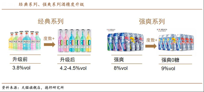 經(jīng)典案例:根據(jù)天貓旗艦店、德邦研究所等綜合資訊表明,百潤(rùn)股份公司酒精度數(shù)向高度數(shù)延伸,覆蓋更廣泛客群。2020年,其對(duì)經(jīng)典系列進(jìn)行產(chǎn)品升級(jí),除包裝升級(jí)外,酒精度數(shù)從原來(lái)的 3.8%vol 上升至 4.2-4.5%vol。在強(qiáng)爽系列取得較好反響后,2021年其推出強(qiáng)爽 0 糖系列,在原基礎(chǔ)上度數(shù)+1,整體 呈現(xiàn)高度數(shù)升級(jí)的趨勢(shì)。
