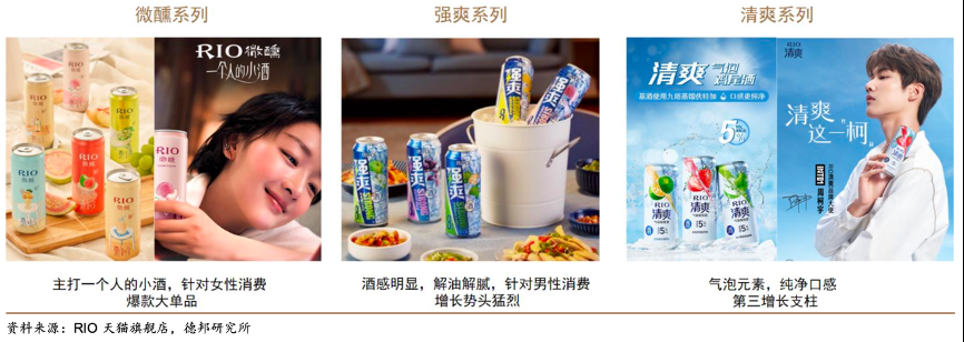 經(jīng)典案例:根據(jù)RIO天貓旗艦店、德邦研究所等綜合資訊表明,2018年微醺系列升級(jí),主打“一個(gè)人的小酒”場(chǎng)景定位,精準(zhǔn)定位個(gè)人獨(dú)飲,關(guān) 注女性消費(fèi)群體,加之消費(fèi)場(chǎng)景的宣傳培育,微醺系列成為爆款大單品。2016 年公司針對(duì)男性消費(fèi)群體推出強(qiáng)爽系列,酒精度提升到 8%vol,酒感更明顯,定位重油重辣餐飲消費(fèi)。