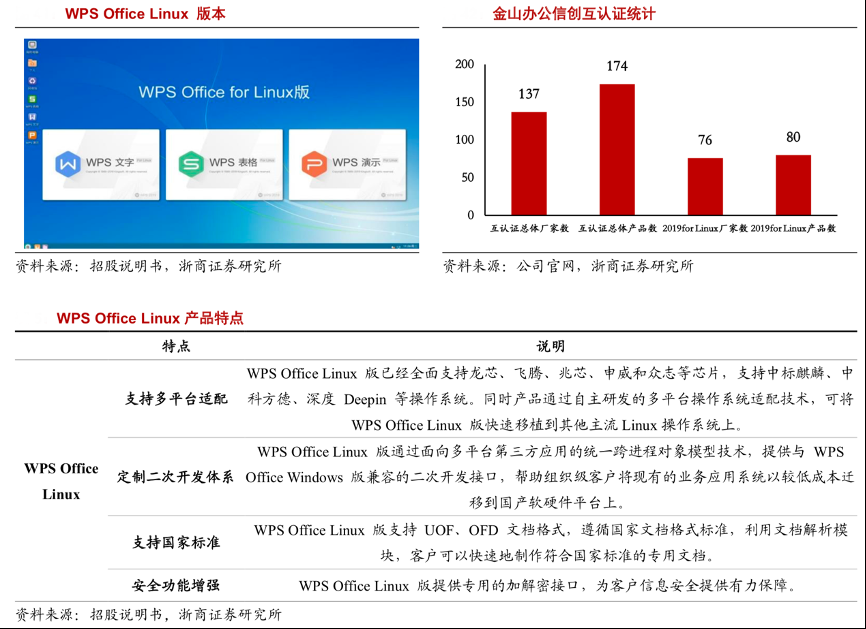 經典案例:根據公司官網、招股說明書、浙商證券研究所等綜合資訊表明,截至 2020 年 12 月 31 日,金山辦公公司已累計和 260 家國內辦公生態伙伴完成產品適配,與龍芯、飛騰、鯤鵬、統信、麒麟、長城等基礎廠商緊密合作,產品適配涵蓋協同辦公、輸入法、郵件、語音識別,以及手寫板和平板等多個領域,形成完整的解決方案。目前,金山辦公公司產品已在國家多項重大示范工程項目中完成系統適配和應用推廣。
