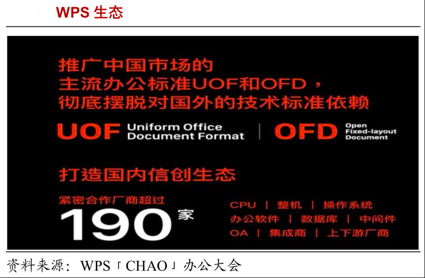 經典案例:根據WPS辦公大會、浙商證券研究所等綜合資訊表明,金山辦公聚攏兩大生態以鞏固其龍頭地位:一是面向個人用戶的 WPS 辦公服務生態聯盟,包括中國金融認證中心(CFCA)、萬得信息、數科網維、學科網、方正手跡等 5 家 合作伙伴;二是面向政企用戶的 WPS 協同辦公生態聯盟,包括麒麟、統信、京東智聯云、華為云、金山云、泛微、藍凌、致遠等生態鏈伙伴企業。