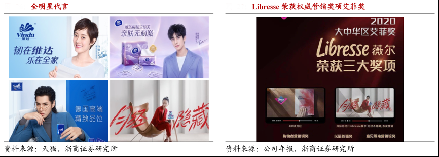 經典案例:根據天貓、公司年報和浙商證券研究所等綜合資訊表明,維達公司是衛(wèi)生用品企業(yè)中唯一一家采用全明星代言戰(zhàn)略的公司,“維達”品牌擁有雙代言人“韌性媽媽”孫儷及年輕流量宋威龍,贏得主力消費群體中年、青年女性群體的青睞;“得寶”、“Libresse”選用吳亦凡、周冬雨,迅速拓寬品牌與目標消費群的溝通渠道。2020 年,Libresse 推出“月經不隱藏”活動,攜手代言人周冬雨鼓勵女性勇敢表達、打破束縛,引起消費者共鳴。該活動亦獲得業(yè)內權威營銷獎項艾菲獎 2020 年 KOL 營銷銅獎。