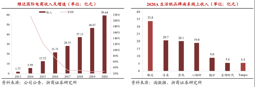 經典案例:根據公司公告、淘數據、浙商證券研究所等綜合資訊表明,維達公司與京東、天貓深度合作,通過大數據實現精準營銷、定制化產品,推出更適合線上銷售的大包裝產品(線上渠道銷售以 24 包或 48 包/條為主,線下以 3 包/條為主)。此外,維達公司與京東合作建設智慧供應鏈+協(xié)同倉,實現高效配送,為電商渠道發(fā)展打下夯實基礎。2020 年維達國際淘系銷售額達 39.3 億元(維 達 33.8 億元、得寶 5.5 億元),遠超潔柔銷售額 20.7 億元、清風銷售額 20.1 億元、心相印銷售額 19.0 億元。