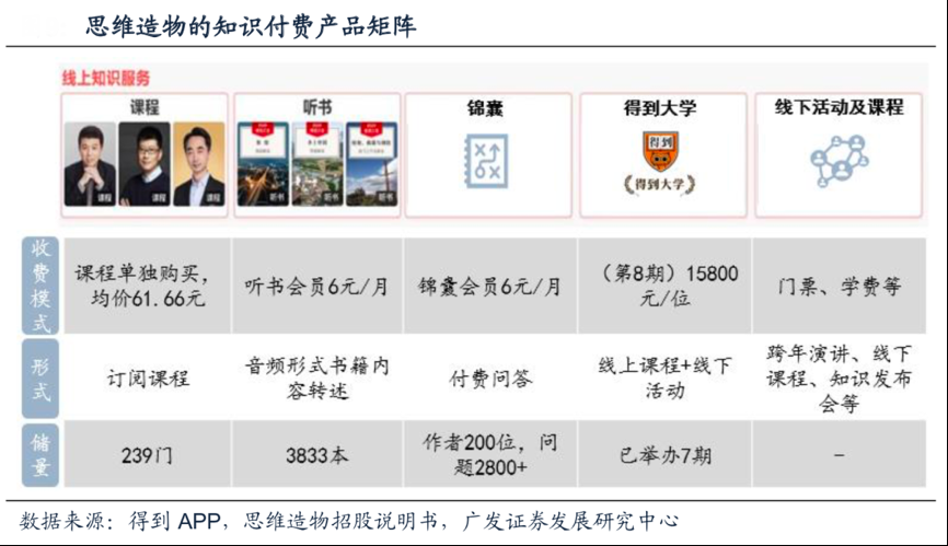 經(jīng)典案例:根據(jù)得到APP、思維造物招股說(shuō)明書、廣發(fā)證券發(fā)展研究中心等綜合資訊表明,思維造物提供的知識(shí)付費(fèi)產(chǎn)品主要包括訂閱課程、講書、付費(fèi)問(wèn)答、得到大學(xué)、線下活動(dòng)及課程這五種形式。訂閱課程的內(nèi)容涉及應(yīng)用技能類、商學(xué)類、科學(xué)類和人文類,用戶通過(guò)訂閱課程付費(fèi),單個(gè)課程的售價(jià)在19.9-365元之間,期數(shù)在5-394 講不等,每講時(shí)長(zhǎng)一般在10-20分鐘。