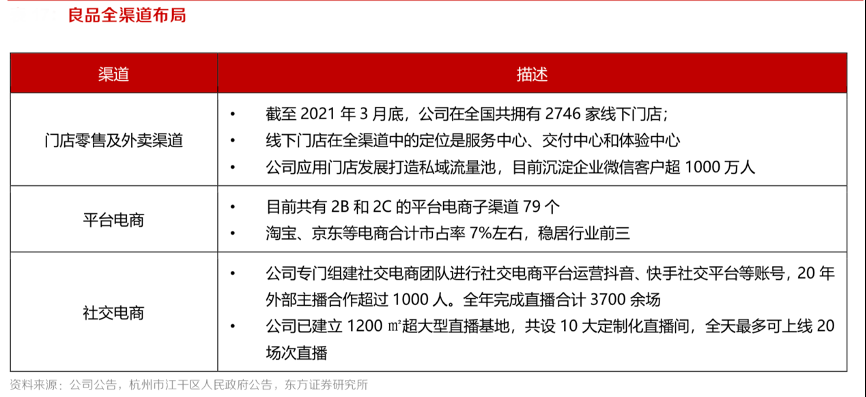 經典案例:根據公司公告、杭州市江干區人民政府公告、東方證券研究所等綜合資訊表明,良品鋪子公司的全渠道布局基本完成,其公司加盟模式發展多年,模式成熟且具有吸引力,同時其全品類布局模式 +品牌力使得公司傳統電商龍頭地位仍有望繼續保持,具備一定競爭壁壘。