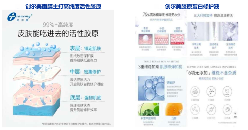 經典案例:根據創爾美天貓旗艦店、申萬宏源研究等綜合資訊表明,創爾生物進一步發揮活性膠原的優勢,除了醫療器械產品,其妝字號生物護膚品可以添加更多成分,與醫用械字號敷料形成互補,針對問題肌膚的輔助性治療,以及修復皮膚屏障,適用于大部分膚質(尤其是熬夜肌),拓寬適用面。