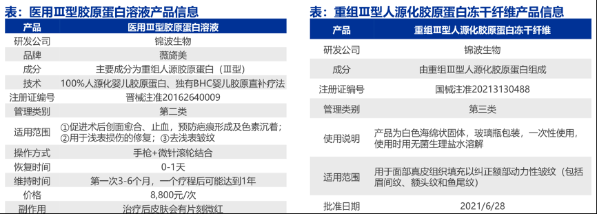 經典案例:根據國家藥監局、新氧、申萬宏源研究等綜合資訊表明,錦波生物“醫用III型膠原蛋白溶液”是旗下品牌薇旖美的全球首款100%人源化嬰兒膠 原產品,能直接補充人因年齡增長而流失的III型膠原蛋白,快速修復人皮膚中斷裂的 膠原蛋白和受損的細胞,促使細胞高效再生和增殖,讓肌膚變得飽滿、有彈性。
