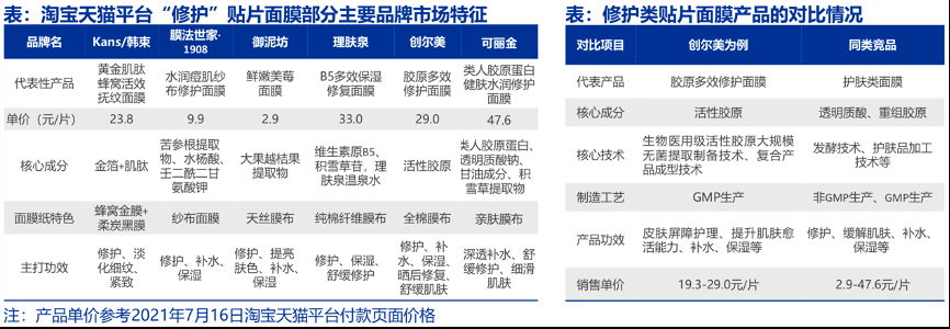 經典案例:根據標點醫藥、品牌天貓旗艦店、創爾生物招股書、申萬宏源研究等綜合資訊表明,膠膠原蛋白主打活性膠原修復、差異化競爭,其TOP 15品牌的價格區間約在3-54元/片之間,其中膠原蛋白類定價偏高,屬于中高端定位。膠原生廠商產品矩陣擴張方面,創爾生物等在醫療器械產品的基礎上,同步開發妝字號產品,添加更多成分,以達到修復之外的更多護膚功效。