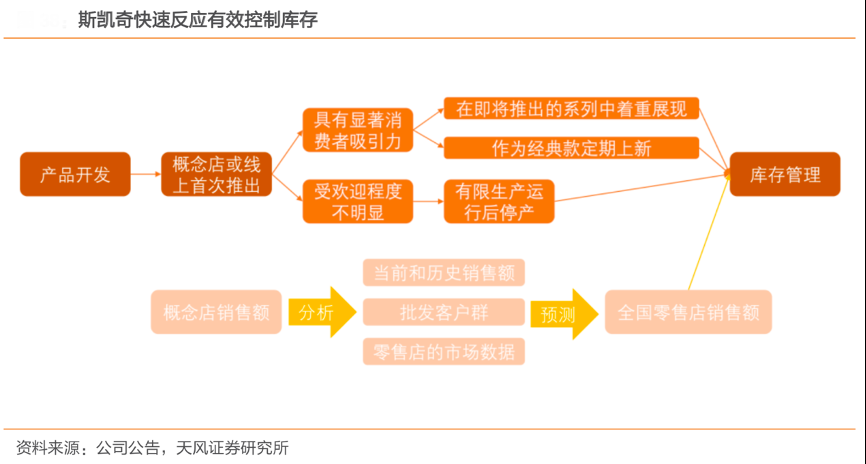 經(jīng)典案例:根據(jù)公司公告、天風證券研究所等綜合資訊表明,斯凱奇概念店的銷售額有助于預(yù)測全國零售店的銷售額,并向批發(fā)客戶提供此數(shù)據(jù)信息。銷售、生產(chǎn)和分配管理分析當前和歷史銷售以及來自批發(fā)客戶群和自己零售店的市場數(shù)據(jù),以制定內(nèi)部產(chǎn)品數(shù)量預(yù)測,管理未來生產(chǎn)和庫存水平。對于銷售率高的款式,保持庫存狀況,其通過在收到客戶此類鞋類訂單之前向制造商下訂單,以最大限度地減少完成客戶訂單所需時間,有效控制庫存,提升庫存周轉(zhuǎn)效率。