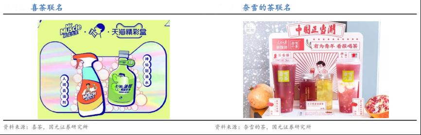經(jīng)典案例:根據(jù)喜茶、奈雪的茶、國(guó)元證券研究所等綜合資訊表明,奈雪的茶曾與好歡螺、老佛爺、元?dú)馍帧⒌萝健⑼雀鱾€(gè)不同行業(yè)的品牌合作;喜茶曾與多芬、七喜、QQ 音樂(lè)跨界合作。除了在茶飲的合作以外,周邊產(chǎn)品也常與品牌聯(lián)名或攜手知名設(shè)計(jì)師設(shè)計(jì)產(chǎn)品,如喜茶×Contigo 吸管杯、奈雪×拉脫維亞藝術(shù)家Roberts Rurans 牽手系列奈雪杯。