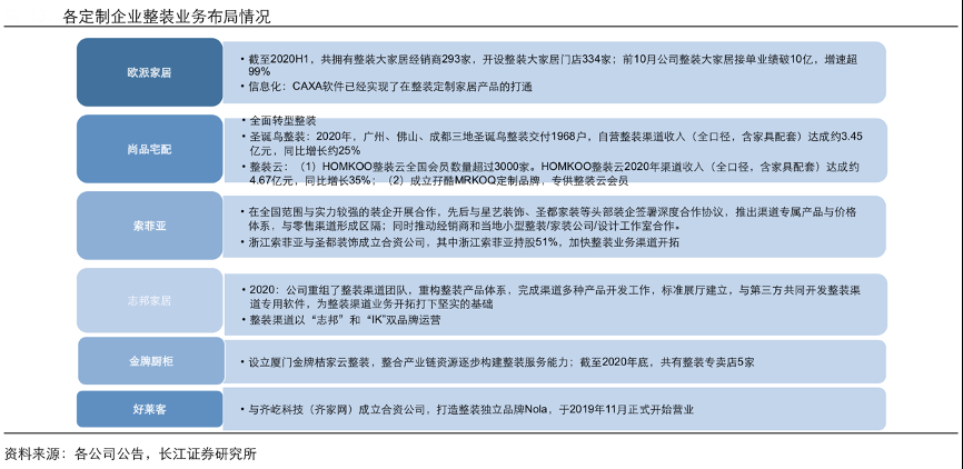 經(jīng)典案例:根據(jù)各公司公告、長江證券研究所等綜合資訊表明,家居定制企業(yè)以合作、賦能兩種思路探索整裝業(yè)務(wù),合作在于渠道合作(引流)、供應(yīng)鏈的合作(如成立合資子公司等),賦能則在于品牌、信息化、供應(yīng)鏈 等方面(如整裝大家居、整裝云等模式)。