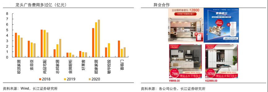 經(jīng)典案例:根據(jù)wind、各公司公告、長江證券研究所等綜合資訊表明,全國性品牌企業(yè)在營銷/渠道資源上更具備優(yōu)勢,包括但不限于廣告投放(龍頭廣告投放多是億元級的)、頭部賣場的深度合作(與核心賣場如紅星美凱龍、居然之家以及部分強(qiáng)勢的區(qū)域賣場達(dá)成戰(zhàn)略合作)以及頭部品牌的異業(yè)合作等。