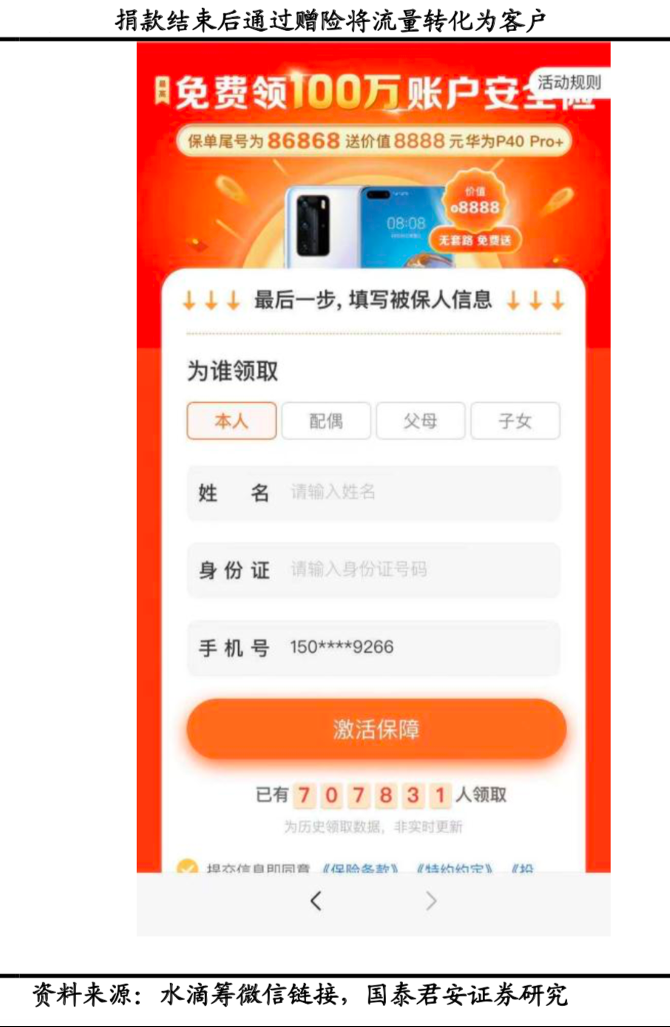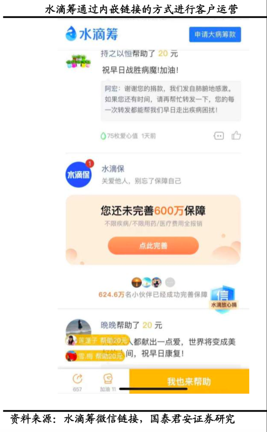 經(jīng)典案例:根據(jù)水滴籌微信鏈接、國泰君安證券研究等綜合資訊表明,水滴公司在水滴籌的籌款頁面中添加了數(shù)個百萬醫(yī)療險(xiǎn)的跳轉(zhuǎn)鏈接,當(dāng)客戶瀏覽籌款頁面時即可看到“您的保障尚未完善”的提示。這一運(yùn)營方式通過籌款案例放大重疾等極端事件的概率,來喚起客戶心中的保障意識,進(jìn)而完成保險(xiǎn)銷售。