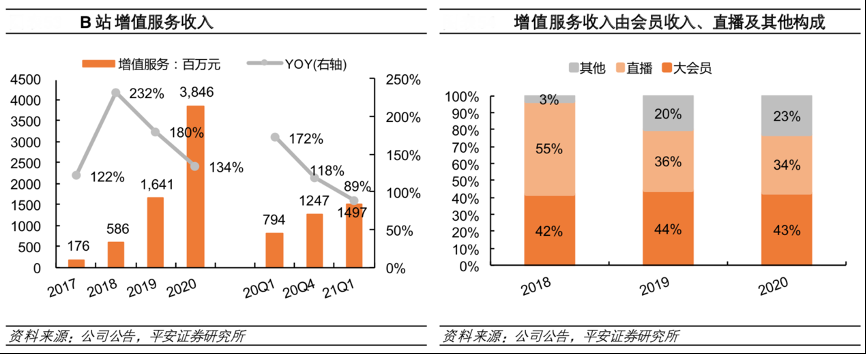 經典案例:根據公司公告、平安證券研究所等綜合資訊表明,B站付費會員收入推動增值服務高速增長,2020年其增值服務收入達到 38.5 億元,同比增長 134%。增值服務收入包括付費會員、直播、動漫及其他,2020 年占比分比為 43%、34%、23%。截止2021Q1,付費會員(主要特權是能看優質的 OGC 視頻)規模達到 1610 萬,同比增長48%,占月活用戶比例達到 7.2%,付費會員規模推動付費會員收入大幅增長。