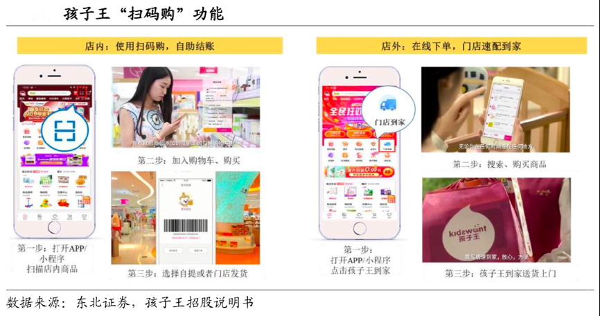 經典案例:根據東北證券、孩子王招股說明書等綜合資訊表明,孩子王公司于 2017年初推出“掃碼購”,之后 整合微信小程序、微信支付、掃一掃等產品功能,當顧客在門店購物時,僅需使用孩子王 APP 或小程序掃描商品條形碼,就可實時查看商品信息及以往消費者評價等;成功下單后即可自助結賬,還推出了“店外掃碼購”業務,在原有基礎上進行升級,消費者在孩子王 APP 選定門店后訂購商品或在店外可直接掃描商品條形碼下單,并由就近門店直接配送到家,真正實現了 7×24h 的無界購物體驗。