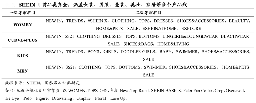 經(jīng)典案例:根據(jù)SHEIN、國泰君安證券研究等綜合資訊表明,SHEIN 的前身是一家主營婚紗銷售的跨境電商公司,2012 年正式轉(zhuǎn)型跨境女裝,隨后覆蓋女性用戶各類服飾,主要包括裙裝、上裝、下裝、鞋類、首飾以及配件等六大品類。2017-2019年 SHEIN 加快品類建設(shè)步伐,目前官網(wǎng)的一級導(dǎo)航欄目已囊括 女裝、大碼女裝、童裝、男裝四大品類,在二級導(dǎo)航欄目中亦涵蓋了包 括美妝、家居、寵物等品類。