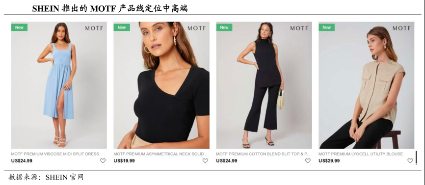 經(jīng)典案例:根據(jù)SHEIN官網(wǎng)、國泰君安證券研究等綜合資訊表明,SHEIN此前推出定位中高端消費的 PREMIUM 產(chǎn)品線,其裙裝系列價格基本在 10-60 美元(秋冬服裝價格更高/飾品類價格更低)。根據(jù) SHEIN 官方此前表示,SHEIN PREMIUM 即將更名為 MOTF,獨立網(wǎng)站即將上線,并發(fā)布了 MOTF 的供應(yīng)鏈招商計劃。目前,MOTF 包括:城市之光(City Lights)、新經(jīng)典(New Classic)、 甜蜜浪漫(Sweet Romance)和派對模式(Party Mode)、舒適系列(Comfy Collection)等類別。