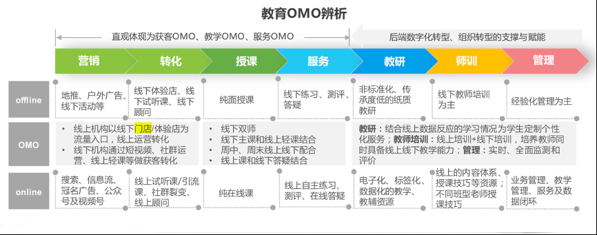 經典案例:根據《20210621-艾瑞咨詢-教育行業2021年教育OMO發展趨勢報告:熱烈與冷靜》、艾瑞咨詢研究院等綜合資訊表明,OMO是伴隨技術進步、新的流量紅利消退、產業鏈和價值鏈重構、行業競爭加劇,企業需要尋找更有效率的經營方式而產生的新業態。技術進步為更有效率的獲客、教學、服務和運營管理方式的實現提供可能;流量紅利消退、行業競爭加劇推動產業鏈相關方尋找更適合自身的商業模式和更精細化的運營管理方式,而疫情的偶然因素進一步讓OMO按下快進鍵。