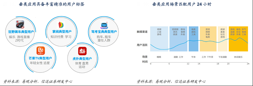 經典案例:根據易觀分析、信達證券研發中心等綜合資訊表明,結合穿山甲與易觀聯合發布的《中國垂類應用流量營銷價值洞察》,2020 年 11 月全網人均 每月使用 APP 個數為 25.2 個,各類 APP 使用時長較為平均,用戶觸達媒體呈現多元化與 碎片化特征。當前垂類應用正處高速成長期,社交電商、有聲閱讀、游戲平臺活躍用戶增速遠高于全網,2020 年 9 月垂類應用使用時長僅次于騰訊系,占全網用戶使用總時長比例超 過 1/4。垂類應用具備較高營銷價值。